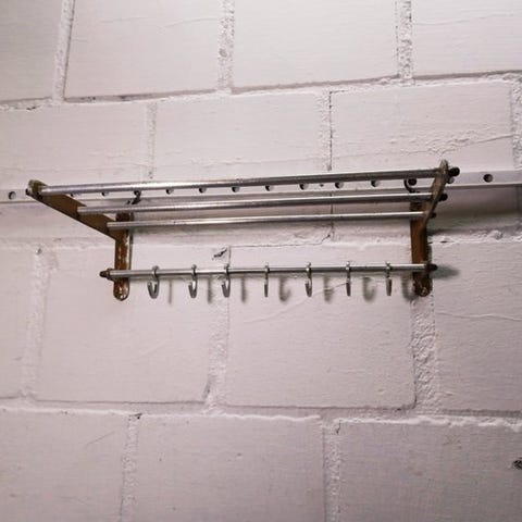 Polskproduceret industrielt vintage kleshanger i stål og træ, sort, 51 cm bred, 19 cm høj, 21 cm dyb, dateret fra 1960’erne til 1980’erne, i god brugt stand med mindre ældningstegn. Klik på den blå "gå til varen" knap, for at købe eller byde på denne vare. Den samlede pris vil blive vist inden du afgiver dit bud.