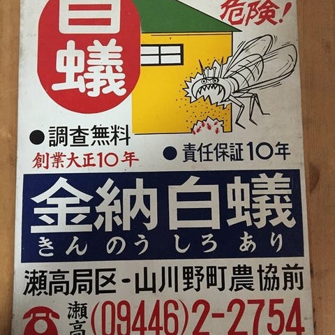 Rundt om logoet står der japanske tekster, hvoraf “日の出印”, som henviser til mærket “Hinode”, bogstaveligt talt “solopgang”. Skiltet fungerede som reklame for sytråd og kombinerer japansk og engelsk skrift, hvilket er typisk for eksportorienterede produkter fra midten af det 20. århundrede.
