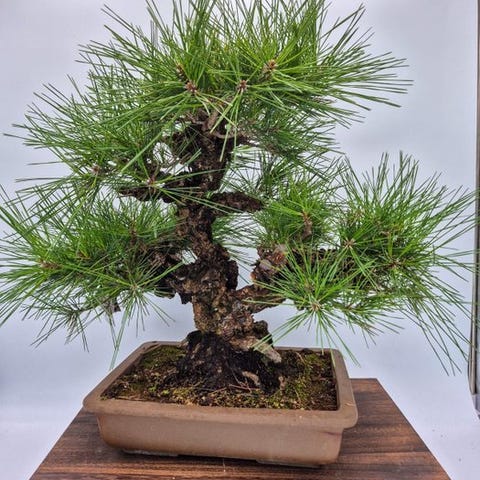 Et bemærkelsesværdigt bonsaitræ af japansk sortfyr (Pinus thunbergii), sjælden Corticosa-variant. Denne kulturvariant beundres især for sin korkagtige barktekstur, som udvikler sig tidligere end hos almindelige sortfyr, og giver træet et udseende af stor alder og karakter.