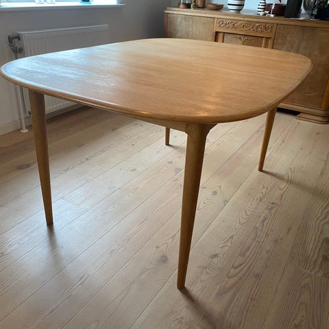 Spisebord i massiv egetræ med to tillægsplader.