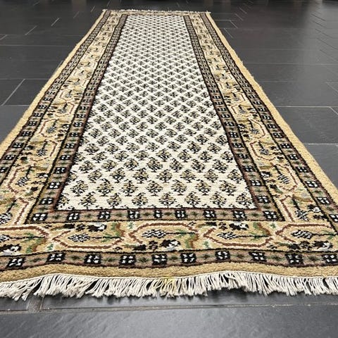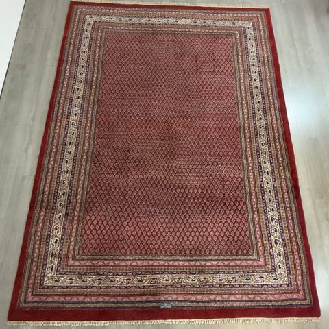 Det dybrøde felt er fuldt udlagt med det typiske Mir-motiv – små, regelmæssigt anordnede Boteh- eller bladornamenter, som skaber en rolig, jævn struktur. Den fleretrins, omkringgående bordur med florale elementer i beige, mørkeblå og varme naturtoner danner en harmonisk ramme og fremhæver den runde form særligt elegant. Den samlede virkning er klassisk, afbalanceret og dekorativ – ideel som midtpunkt i opholds- eller spisestuer.