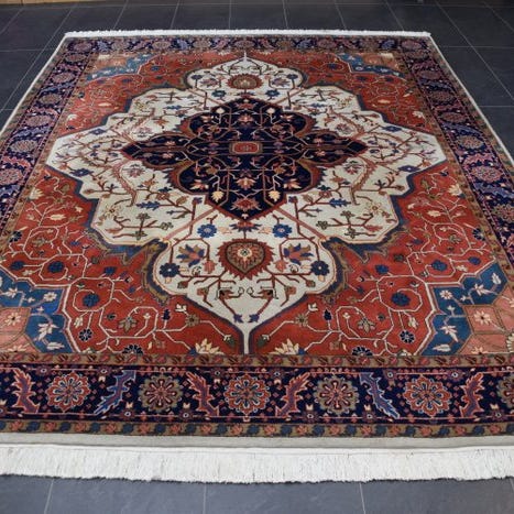 Håndvævet Heriz tæppe fra Indien, 21. århundrede, uld på bomuld, størrelse 326 × 234 cm, model Heriz - Renset, professionelt renset og generelt i god stand. Klik på den blå "gå til varen" knap, for at købe eller byde på denne vare. Den samlede pris vil blive vist inden du afgiver dit bud.