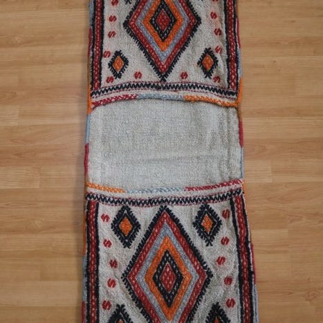 Et vintage afghansk stammekelim-sadeltaske håndvævet i uld uld. Disse tasker blev traditionelt brugt til at opbevare salt eller andre små krydderier, mens man rejste på æsel eller hest. Denne saddeltaske har en flerfarvet bagside med traditionelle stamme-motiver på forsiden af taskerne. Tasken er fremstillet i Soumak Kelim vævning på forsiden og i en flat flerfarvet stribet kelim-væv på bagsiden.