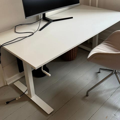 IKEA TROTTEN hæve-sænkebord stel i hvidt metal. Stellet har manuel håndsving til justering af bordhøjde. Bemærk at det hele er afmonteret, så man nemt kan transportere det hjem i bil. Bordplade kan seperat købes i IKEA.