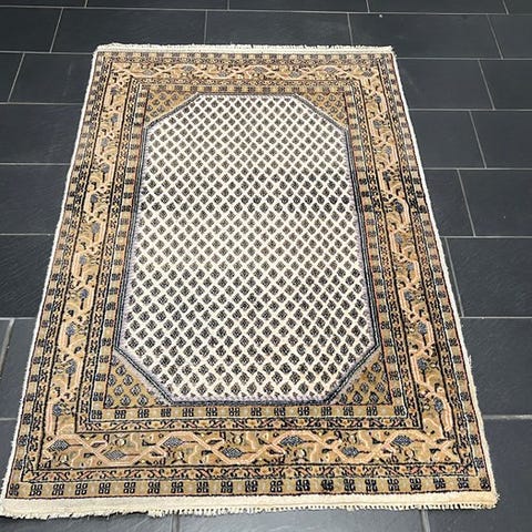 Denne elegante Sarough Mir er håndvævet af uld på bomuld og kendetegner sig ved det karakteristiske Mir-e-Boteh mønster. I pæn stand med brugsspor gennem tidens tand – et tidløst stykke håndværk der kan ligges direkte. Minimale brugsspor til stede (et par, ikke generende, pletter), se detailbilleder.