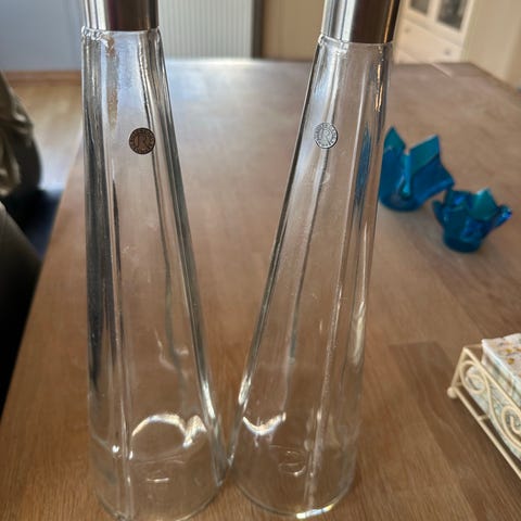 Rosendahl lysestager i klart glas. Sættet består af to ens stager med bred kant foroven og cylindrisk fod. Diskret metalring mellem fod og overdel. Velegnet til bloklys eller fyrfadslys afhængigt af størrelse. Neutral, enkel formgivning der passer ind i mange typer borddækning og indretning.