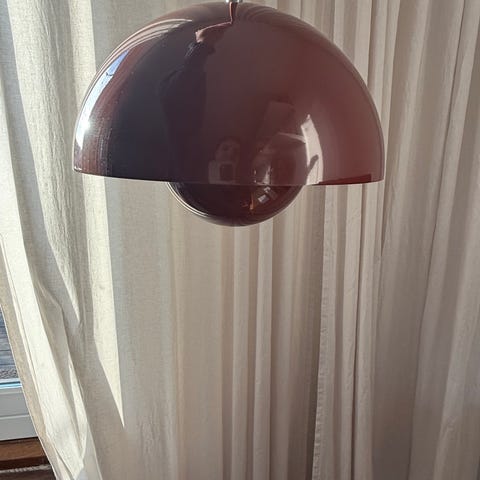 2 stk &Tradition flowerpot loftlampe designet af Verner Panton. De er mørkeblå, med hvid inderside på skærmen. Lampen har synlige brugsspor og mærker i lakken, som fremgår af billederne.