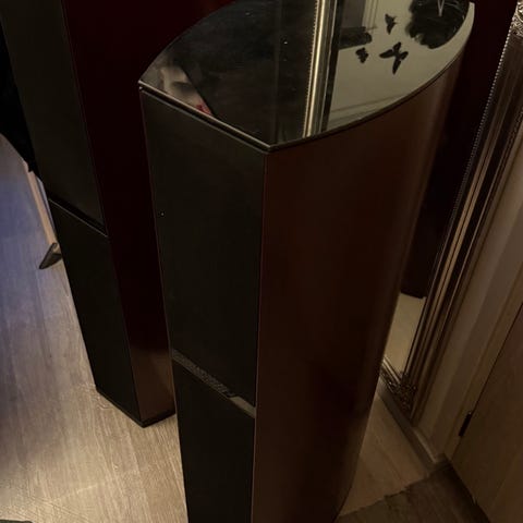 Højtalerne er i super pæn stand og fremstår velholdte. Frontstoffet er helt og kabinetterne er også pæne uden nævneværdige skader.