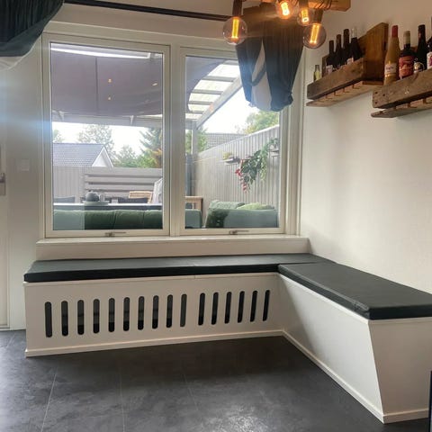 Vi laver også hynder i moderne møbelstoffer og læder lavet på mål så de passer til bænken.