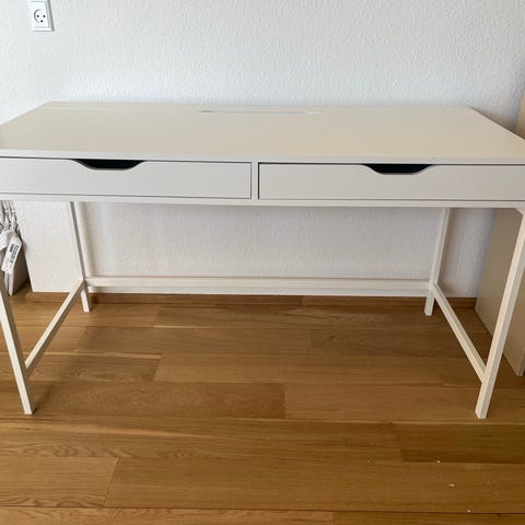 IKEA skrivebord med skuffemodul i hvid. Bordet har en rektangulær bordplade og et integreret skuffeelement i den ene side med flere skuffer til opbevaring af kontorartikler eller personlige ejendele. Egnet som arbejdsbord, studiebord eller sminkebord i hjemmekontor, stue eller soveværelse. Design af Anders Pehrson. Bordet har nogle ridser og er lidt beskidt, men det er helt sikkert noget der kan vaskes væk.