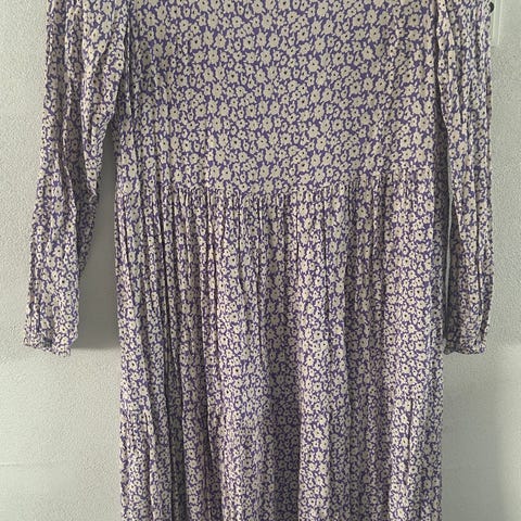 Pieces hverdagskjole i str. S. Kjolen er i lilla viskose med små blomster i kontrastfarve. Langærmet model med rynket talje og let, vævet materiale. Velegnet som hverdagskjole til dame/kvinde. Materiale: viskose (se evt. vaskemærke på billedet for nærmere information om pleje). Farve: lilla med blomstermønster.