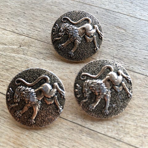 Foto 5-6 Ses 3 skønne ens gamle metal knapper og guld look og prangende Løver