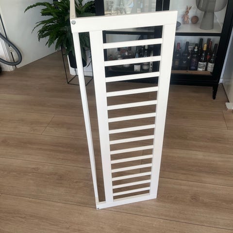 IKEA tilbehør til børneseng i hvid. Består af en ramme med tremmer og hængslet samling, som kan bruges som ekstra side eller afskærmning på en børneseng. Velegnet som sikkerheds- eller sengehestløsning afhængigt af sengemodel og montering. Fremstillet i malet træ eller træbaseret materiale med glat overflade. Farven er hvid, og designet er enkelt og neutralt, så det kan passe til forskellige senge både voksne og børnesenge og sengeløsninger fra IKEA, hvor målene passer.