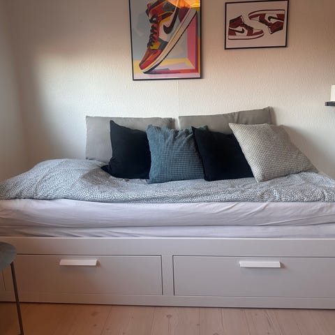 Sengen måler ca. 80x200 cm som enkeltseng og kan trækkes ud til dobbeltseng. Modellen har tre opbevaringsskuffer under liggefladen. I fin stand dog med lidt ridser . Inkl en madres. Hurtig afhentning prioriteres