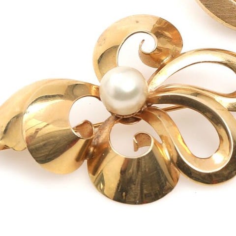 Orgarnisk formet broche af 14 ct. guld prydet med perle (diam. cirka 5 mm). Stemplet BH 585. L. 3,9 cm. Vægt 4,1 gr. Udgået fra Bernhard Hertz.