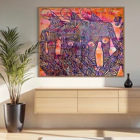 Abstrakt maleri sæt vægkunst i tre dele med firkantede lærreder. Motiverne er i kraftige, blandede farver med blandt andet rød, grøn, blå og orange nuancer. Hvert maleri er indrammet i en enkel ramme og er velegnet til ophængning på væg i stue, gang eller kontor. Sættet giver et sammenhængende udtryk, når de tre billeder hænger side om side.