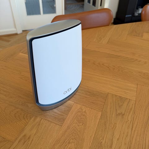 Netgear Orbi router i hvid. Sættet består af tre Orbi-enheder med tilhørende strømforsyninger. På bagsiden af hver enhed er der flere ethernet-porte, USB-port, strømtilslutning og reset-knap. Systemet er egnet som trådløst netværksudstyr i hjem eller mindre kontor, hvor flere enheder kan bruges sammen som mesh-netværk for at dække et større område med wifi.