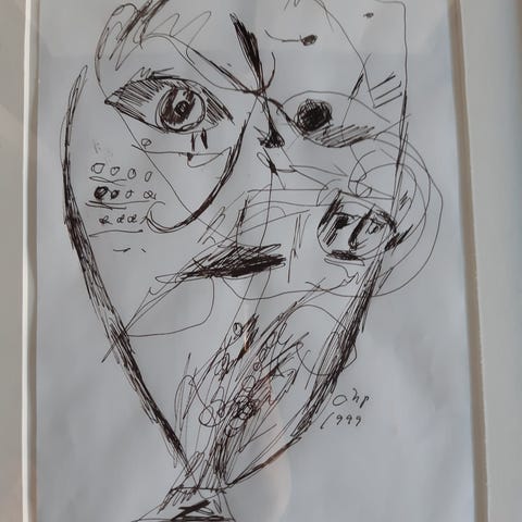 Henning Severin Pedersen 54 cm * 54 cm. Maleriet er monteret i sort ramme. Bagsiden har ophængswire samt fastgjorte udklip og et kort med titlen "When we see it from a side". Velegnet som vægdekoration i stue, kontor eller andre opholdsrum.