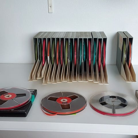 BASF, Agfa og Irish spolebånd til lydoptagelse. Flere bånd i originalemballage, primært BASF med rød cirkel-design samt enkelte Agfa og Irish recording tape. Velegnet til brug med spolebåndoptagere, arkivering eller afspilning af eksisterende optagelser. Størrelse ca. 18 cm spoler (¼" bånd). Sælges samlet som viste blandede mærker og typer. Med forskellige optagelser.