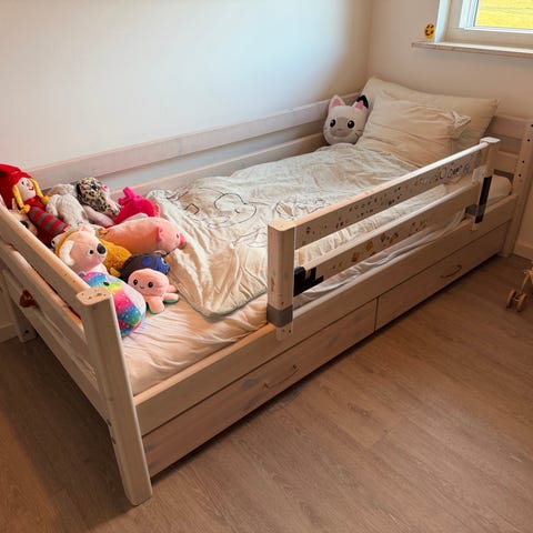Enkeltseng til børn i træ med husseng-ramme. Sengen har tremmer i siderne og en ramme formet som et hus, der kan bruges til ophæng af let pynt eller sengehimmel. Træet fremstår i naturfarve. Egnet som juniorseng/enkeltseng til ét barn. Sengen placeres direkte på gulv med lamelbund eller tilsvarende understøttelse efter behov.