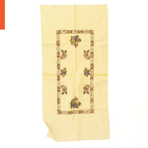Dugen er broderet med et blomsterdesign i gule og sorte nuancer samt grønne kantlinjer. Materialet ser ud til at være af bomuld, og størrelsen af dugen er 140x130 cm. Den ser ud til at være velegnet til dekoration af et bord, hvilket vil tilføje et traditionelt og kunstnerisk præg til indretningen. Tags: broderet, blomster, bomuld
