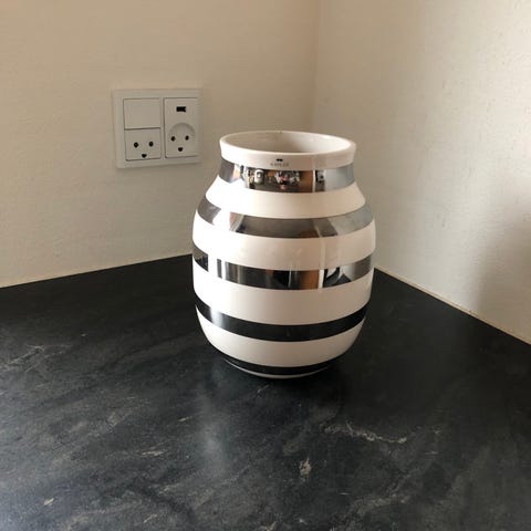 Denne vase er fra mærket Kähler og har en højde på 21 cm. Vasen har en hvid basefarve og er dekoreret med sorte horisontale striber, der giver den et moderne og stilrent look.