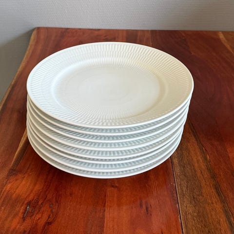 Royal Copenhagen tallerkener i hvid riflet coupe. Tallerknerne er i super fin stand, men de er selvfølgelig brugt og derfor kan der forventes mindre brugsspor fra bestik.