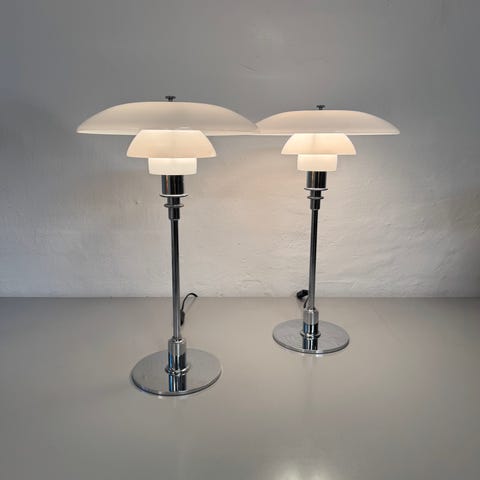 Ikonisk PH 3/2 bordlampe i krom metal og skærmsæt af hvidt glas.