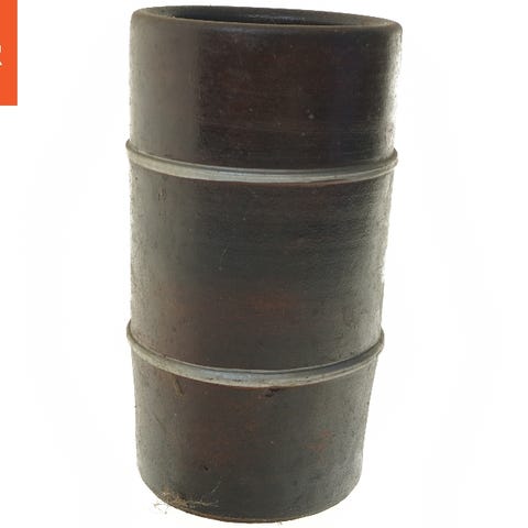 Rustik vase med en diameter på 11 cm. Vasen har en grov tekstur og er primært brun med en grålig overflade. Den har tre små dæk på undersiden for at beskytte overflader.