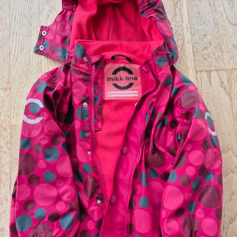 Lilla regnjakke til børn med hætte og lynlås foran. Jakken har elastiske manchetter og reflekterende bånd på ærmerne. Logoet 'Mikk-Line' er trykt på fronten.