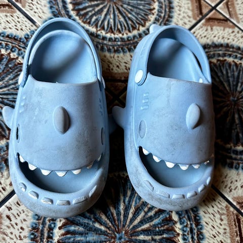 Et par sjove hjemmesko formet som hajer med synlige tænder og finner. Skoene er lavet af gummi og har en lys lilla farve. De kommer med en åben tå-design og er i størrelse 37-38.