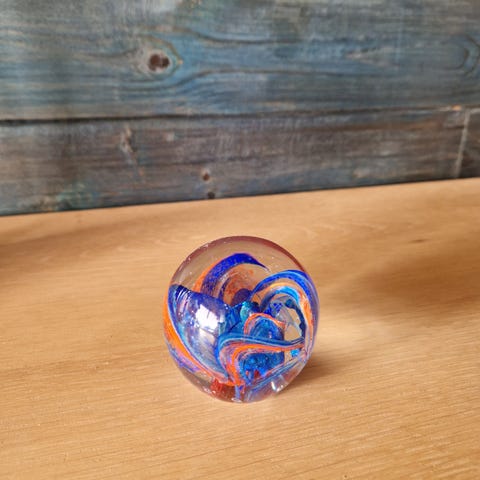 Bornholmsk glaskunst - kugle med en diameter på 4 cm. Spændende indre farvemønster, der inkluderer nuancer af blå og grøn. Overfladen er glat, og farverne varierer i lysstyrke afhængigt af synsvinklen.
