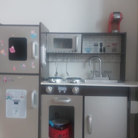 Dette legekøkkensæt indeholder en række plastikmadvarer, herunder pizza, hamburger, æg, grøntsager som gulerod og salat, diverse frugter som banan og appelsin, og drikkevarer som sodavandsflasker og vandflaske. Der medfølger også diverse køkkenredskaber som tallerkner, knive, gafler og en stegepande samt en orange indkøbskurv. Legekøkkensæt er ideelt til rollespil og kreativ leg for børn.