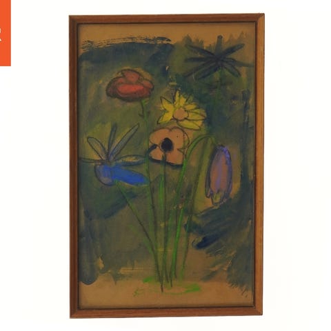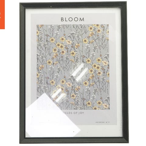 Dette er et indrammet billede med målene 33x24 cm. Billedet har en sort ramme og viser et kunstnerisk tryk med teksten 'POETRY' øverst og 'flower poetry' nederst. Motivet består af en illustration af blomster i en brun/gul farve. Bagsiden af rammen har en ophængsmekanisme, og der er en sort krog for vægmontering.