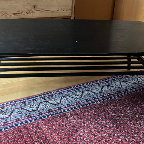 IKEA sofabord i rektangulær form. Bordet er udført i mørkebrunt palisandertræ med lige ben og tværstiver under bordpladen. Overfladen er plan med let hævede kanter langs siderne. Velegnet som sofabord eller sidebord i stue eller opholdsrum. Designet til indendørs brug. Højde 45 cm, bredde 50 cm, længde 100 cm. Meget fin stand.