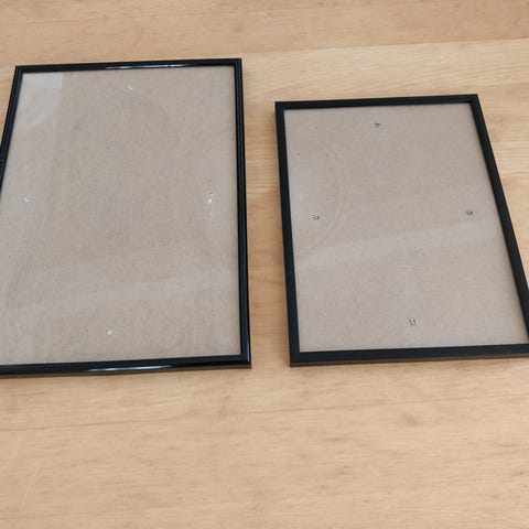 Sæt af to billedrammer, hvor den ene har en sort kant og den anden en lys trækant. Begge rammer har en størrelse på 23x17 cm og inkluderer en bagstøtte til at stå frit på et bord. Billedrammerne kan bruges til at indramme billeder eller kunst og er udstyret med en transparent front for beskyttelse af indholdet.