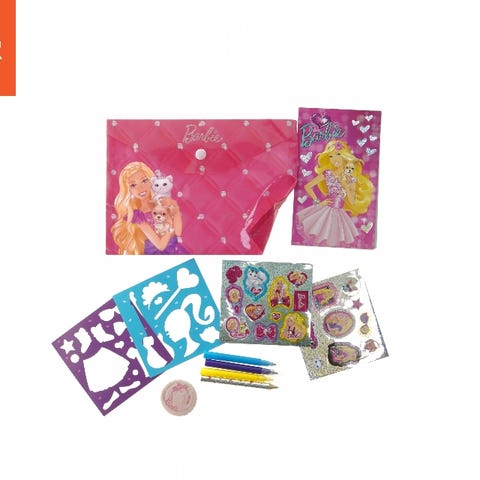 Sæt med Barbie-tema, der inkluderer en transparent pink plastlomme, en Barbie-inspireret stencil og et ark med glitrende klistermærker med forskellige motiver som guitar, tøj og tilbehør. Stencils kan bruges til at tegne motiver på papir eller andre materialer. Klistermærkerne lader børnene dekorere deres materialer med Barbie-temaer. Det hele kommer i en praktisk plastmappe til opbevaring og transport.