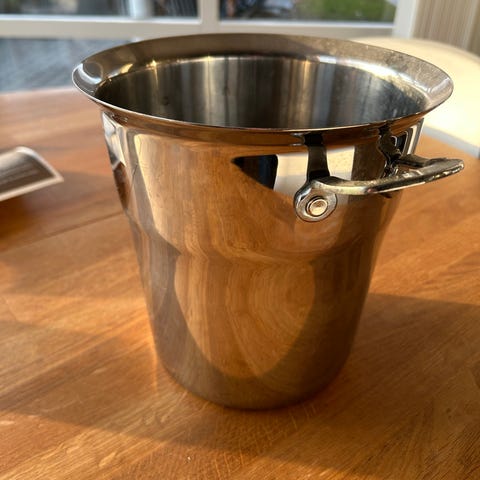 En cylindrisk metalbeholder med en diameter på 10,5 cm og en højde på 18 cm. Den er sort med metalliske kanter og en dekorativ detalje i form af et skib i relief på ydersiden. Indvendigt har den en hvid foring. Bunden viser tegn på rust og slitage, hvilket kunne tyde på, at den har været brugt udendørs eller under fugtige forhold. Beholderen kan bruges til opbevaring eller som dekorativt element i hjemmet eller haven. Tags som kan anvendes inkluderer 'cylinder', 'metal', 'sømand', og 'rustik'.