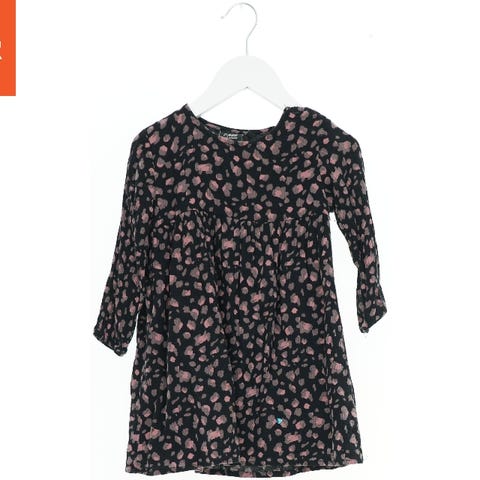 Det er en sort børne kjole med korte ærmer og et mønster af hvide prikker. Kjolen har to forlommer og en lukning i nakken. Stoffet ser behageligt ud, og designet er flot moderne.