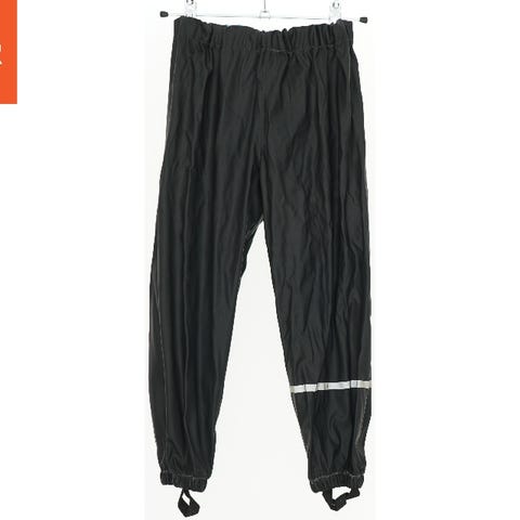 Dette er sorte regnbukser, der er designet til børn. Bukserne har elastik i taljen og ved anklerne for en bedre pasform. De har fodstropper, der hjælper med at holde dem på plads.