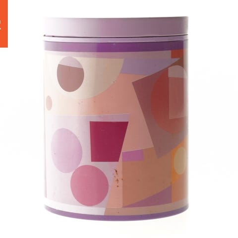 En dekorativ opbevaringsdåse med et retro design. Dåsen har en rund form med en diameter på 11 cm og en højde på 15 cm. Den er udsmykket med et motiv af en kvindefigur og et blad på låget. Indvendigt er dåsen belagt med metal, hvilket giver den en robust struktur. Dåsen kan bruges til opbevaring af småting.