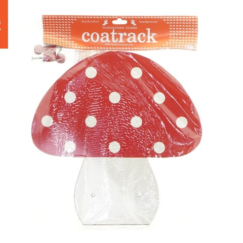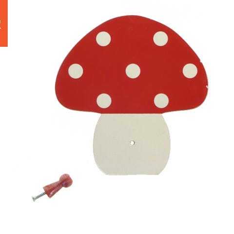 Knage i form af en fluesvamp med en rød top og hvide pletter, designet i en legende stil. Der er en skrue inkluderet til montering af knageknoppen. Størrelsen på dekorationen er 17x16,5 cm. Bagsiden har to metalplader med huller til ophæng. Taget fra website pakhuisoost.com.