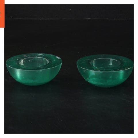 Et par røde glaskunst lysestager til fyrfadslys. De er formet som firkanter med en foldet design, der gør dem unikke og interessante. Ideelle til dekoration på borde eller hylder. Målene for hver lysestage er 11x7,5 cm.