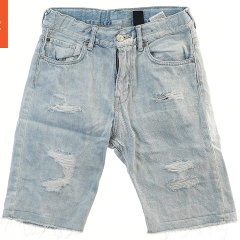 Lyseblå drengeshorts lavet af denim med slidmærker og lommer foran og bagpå. De har elastik i taljen og et lædermærke bagpå.