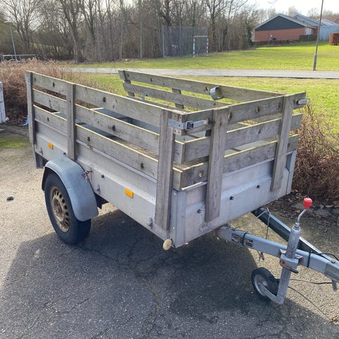 TFV-Trailer T500 L350 trailer i galvaniseret stål. Traileren er en enkelakslet model med ladkasse i metal og tipbar bagklap. Udstyret med næsehjul og standard lygtebom bagtil. Sælges uden papir og plader, afhentes som beset. Traileren er funktionel, men der skal kigges på lyset/ledningsnettet, da der er udfald.