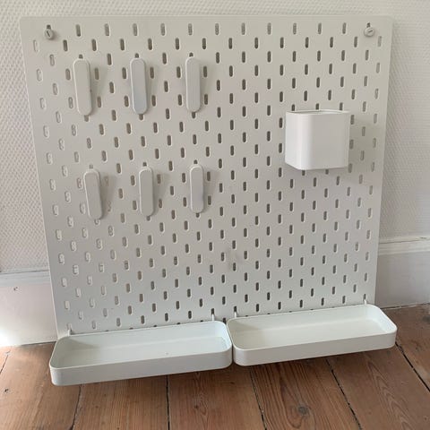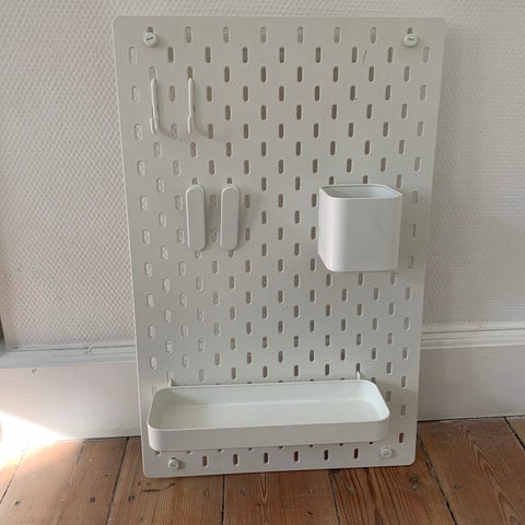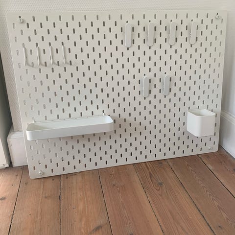 IKEA opbevaringstavle i hvid med tilbehør. Tavlen har perforeret overflade til fleksibel placering af kroge og holdere. Medfølgende tilbehør omfatter blandt andet to hvide beholdere, kroge og ophængsdele, som kan bruges til opbevaring og organisering af mindre genstande på væg. Velegnet til børneværelse, kontor eller andre rum, hvor der er behov for overskuelig opbevaring på væggen.