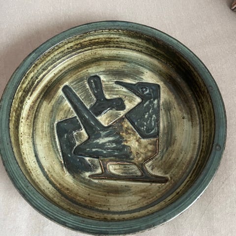 Fajancefad med dekoration af Mogens Andersen. Produceret af Royal Copenhagen i forbindelse med Københavns Universitets 500 års jubilæum. Diameter 25 cm.