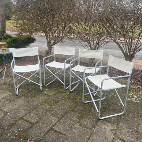 Ældre instruktørstole med råhvidt stof.
