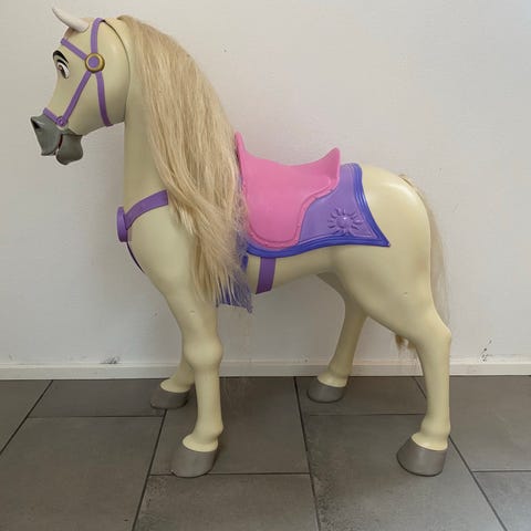 Disney legetøjshest i hård plastik i hvid med lilla og lyserød sadel og seletøj. Hesten har langt, lyst manke, der kan redes og styles. Egnet som ride- og rollelegelegetøj til børn. Står frit på fire ben og kan bruges både inde og ude på jævnt underlag. Leveres med tilbehør i form af et lille plastæble, der kan bruges i legen som foder til hesten.