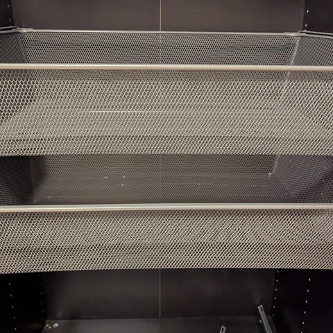 Metal kurve til garderobeskab i sølvfarvet perforeret metal. Kurvene er monteret i et skabs system og er velegnede til opbevaring af tøj, sko eller andre genstande i garderobe eller bryggers. Åben net struktur giver overblik og ventilation af indholdet. Leveres med skinner til montering i skabs sider med forborede huller.